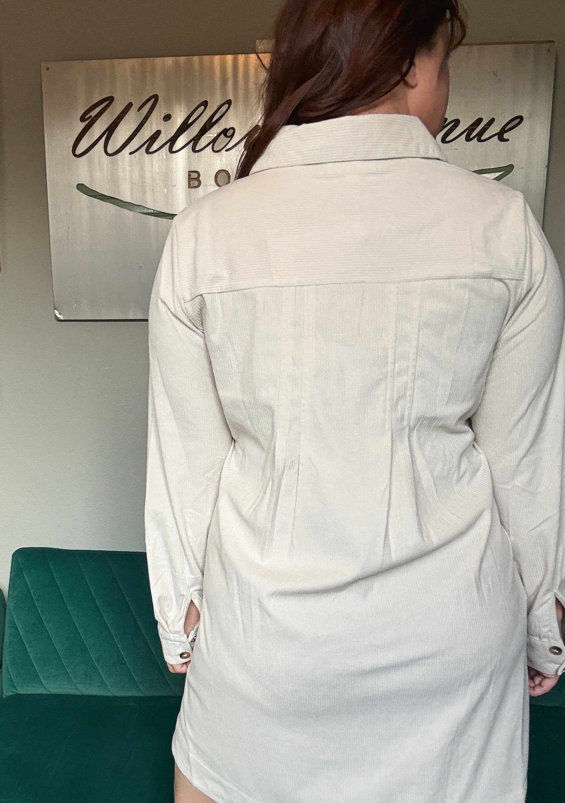 Upgrade your fall wardrobe with our Autumn Corduroy Shirt Dress in Oatmeal. Crafted from soft fabric, this dress offers a relaxed fit and falls at the knee for a stylish yet comfortable look. Perfect for any occasion, this dress is sure to become your new go-to for the season.