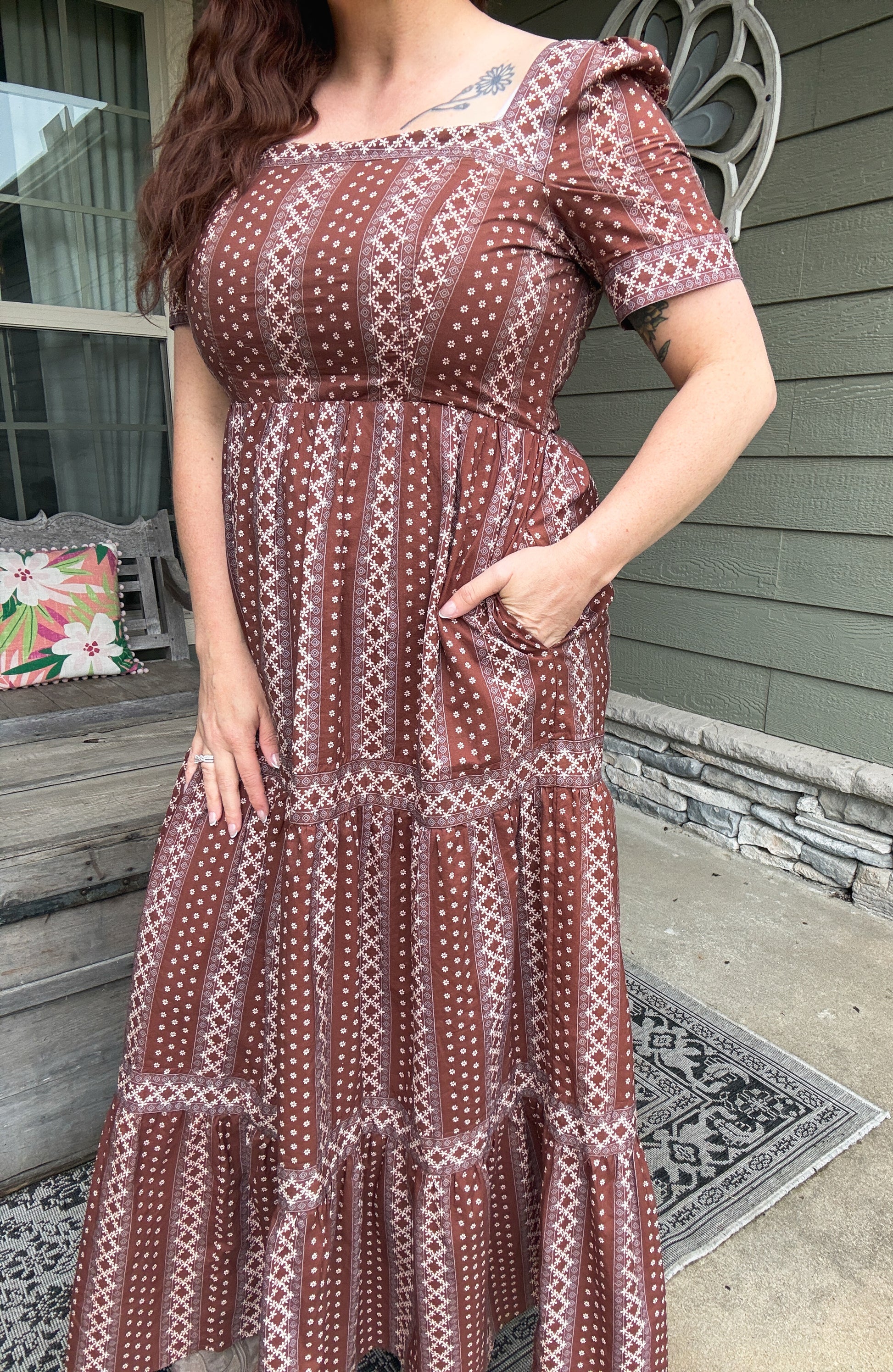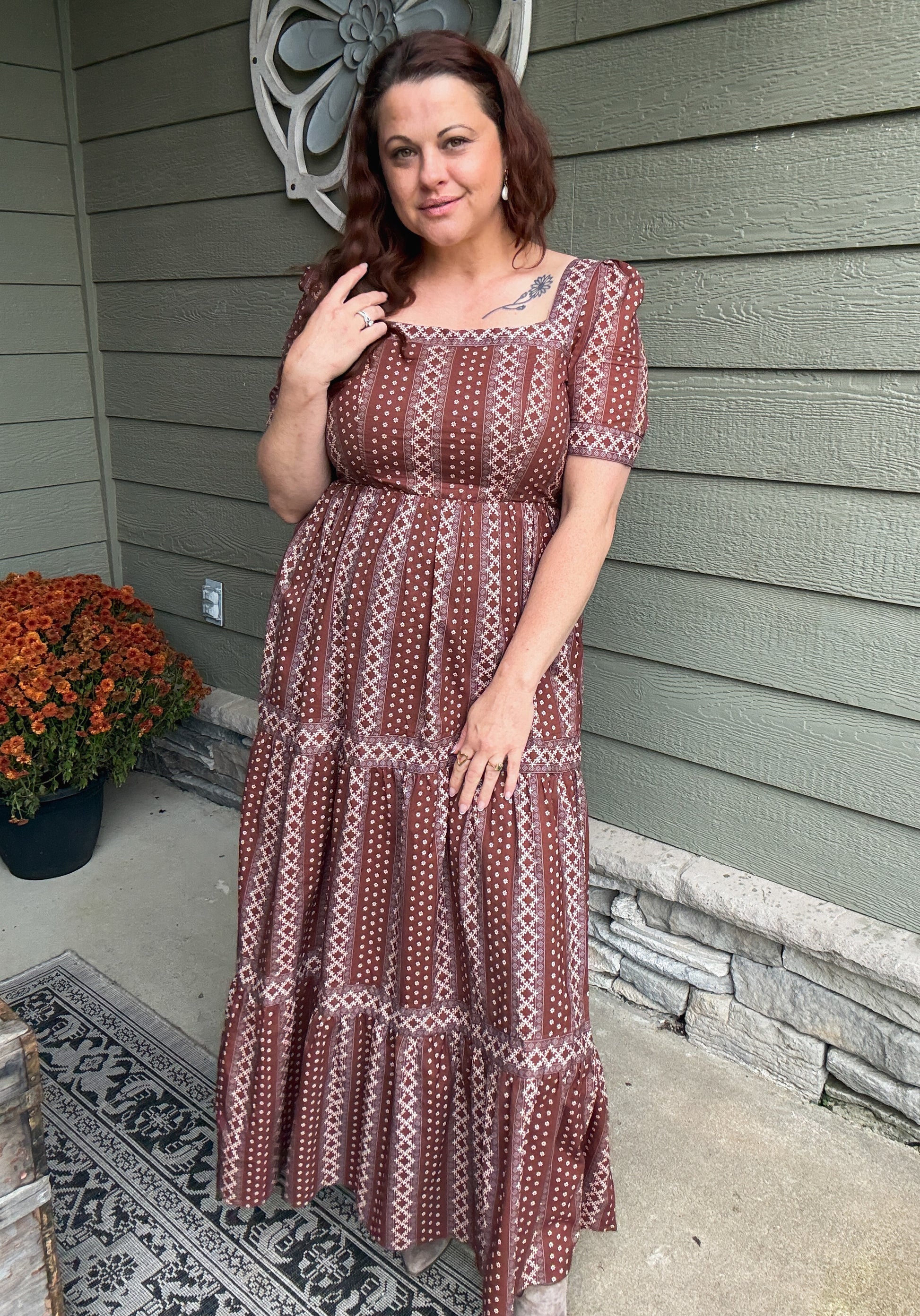 Fall in love with the effortless beauty of our Vintage Fields Maxi Dress. Featuring a beautiful brown hue with a delicate floral stripe print, this dress brings a timeless bohemian touch to your wardrobe.