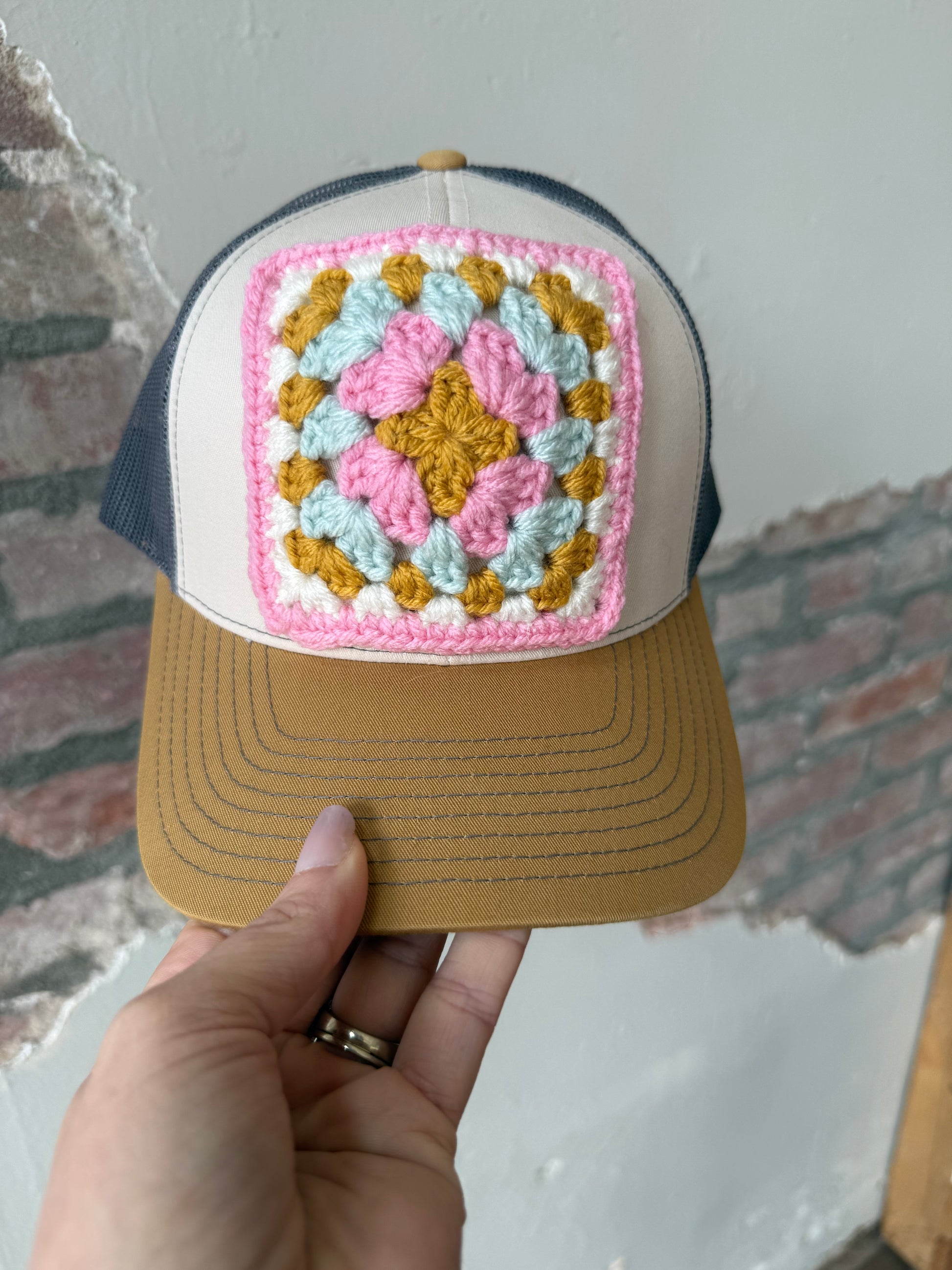 Granny Square Trucker Hat in Lt Pink/White