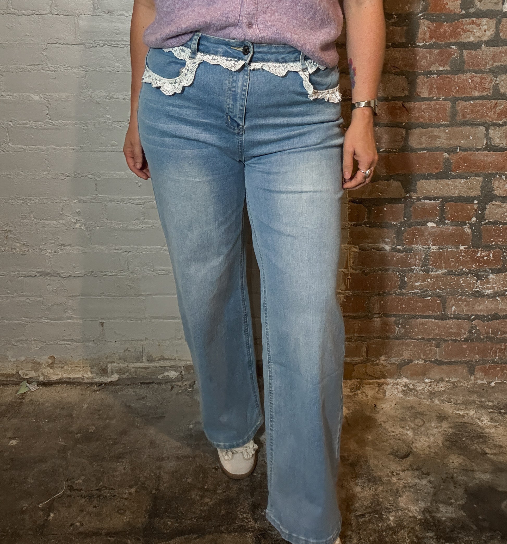 Denim gets a dreamy upgrade with our Ivy Lace Denim Jeans. Designed in a flattering high-rise fit, these wide-leg jeans feature delicate lace trim along the waistband and pockets for a touch of feminine charm. The light wash denim makes them easy to pair with anything in your wardrobe, while the unique lace detail adds a statement you won’t find in your everyday jeans. Style them with a simple tank or a romantic blouse for an effortlessly chic look.