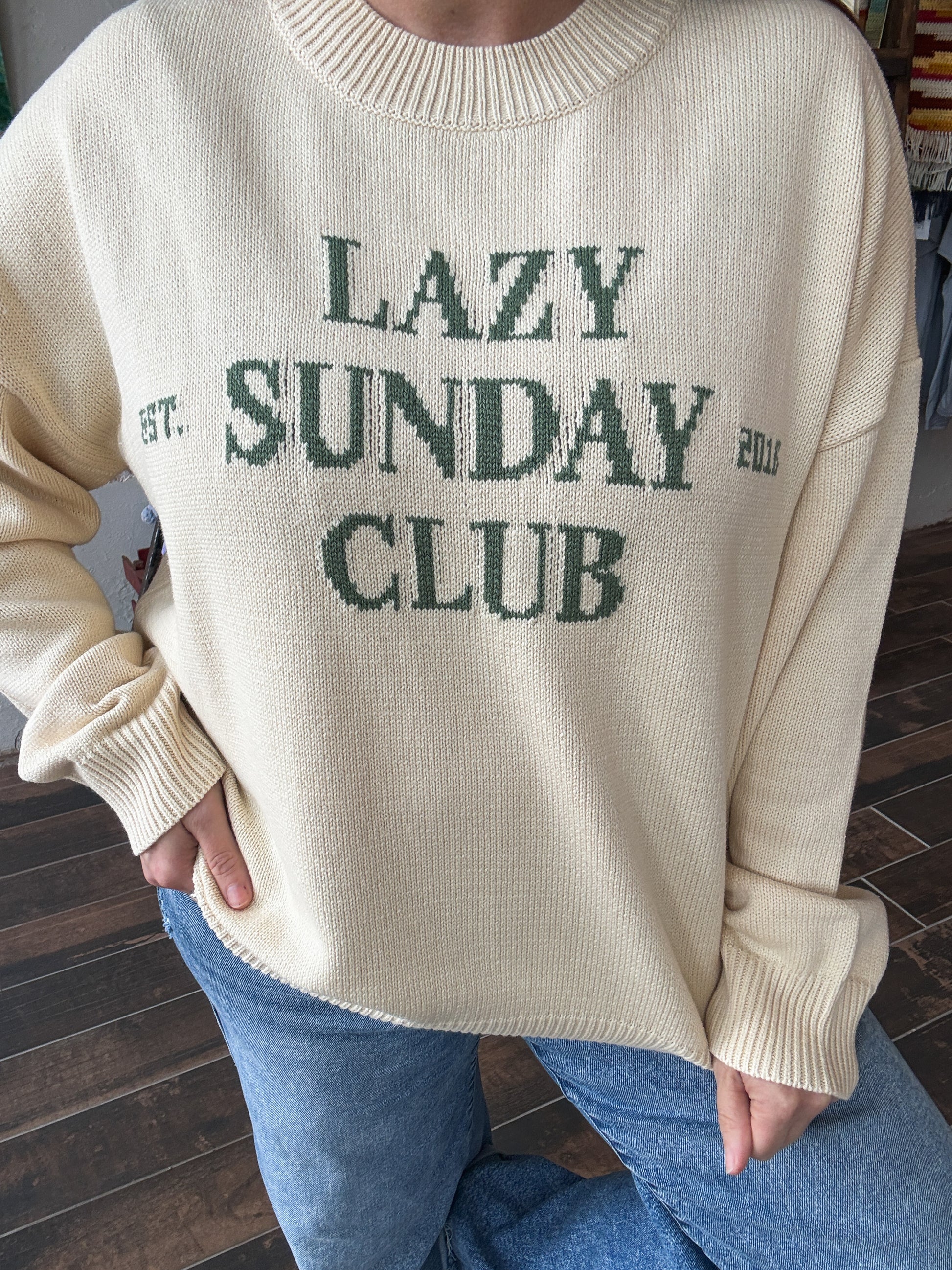 Settle into your slowest, coziest moments with the Lazy Sunday Club Sweater. Designed with an oversized, relaxed fit, this soft knit brings effortless comfort to any day of the week. The front features bold lettering that reads “LAZY SUNDAY CLUB — EST. 2016”, giving it a playful, laid-back vibe.