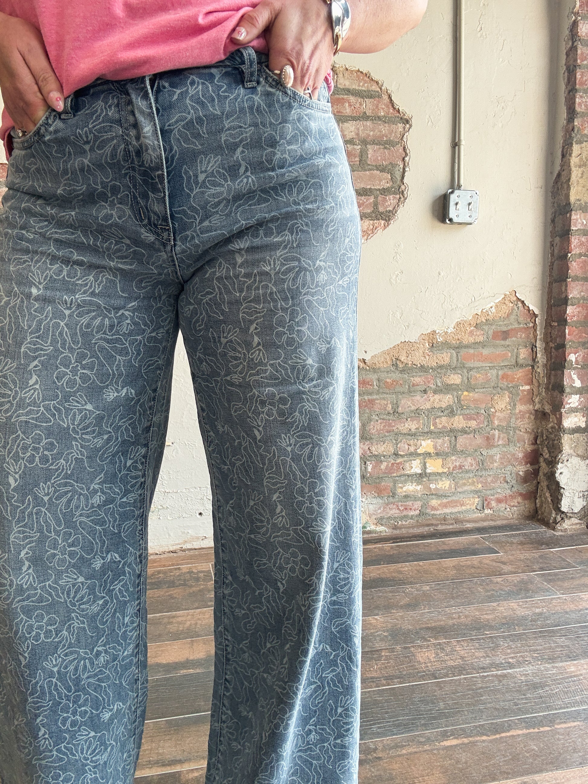Soft, feminine, and effortlessly statement-making — The Wildflower Wide Leg Jeans are made for the free-spirited soul. Featuring a beautiful light-medium wash with a delicate all-over floral pattern, these jeans bring a romantic twist to a timeless denim silhouette.